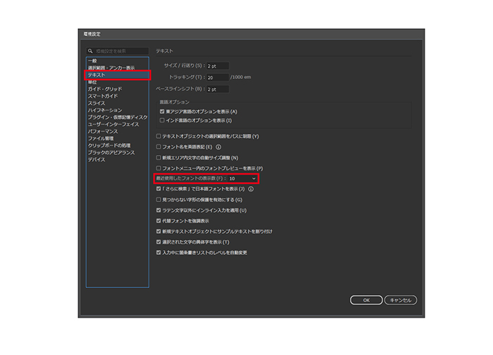 ※もし「最近使用したフォントを使う頻度が高い」場合には、環境設定で、フォントの表示数を「10」などに戻せば、「最近使用したフォント」が再度表示されるようになります。
