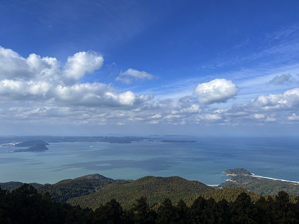 ↑十坊山の坊主岩から望む唐津湾・玄界灘と青空
